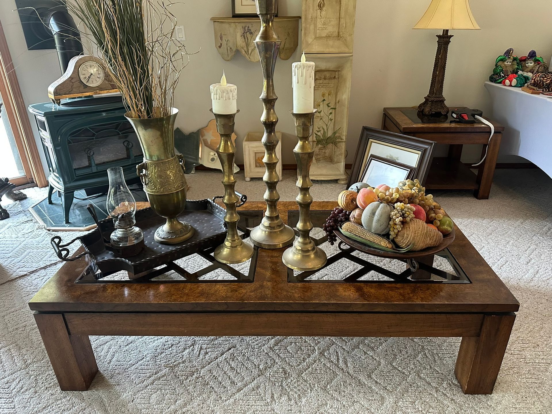 - 3 pc set of wood/glass end table, coffee table and sofa table,